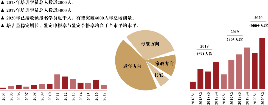为进一步帮助社会从业人员提升技能,更贴近国家发展、社会所需,学校结合有关方面的专家学者开发了诸多特色培训项目,包括:高级催乳、小儿推拿按摩、月子餐、产后康复、蒙氏早教、沪语教学、家庭厨师,康复理疗等课程,名师主讲,小班化教学,提高了学员的综合水平,并结合线上培训平台,进一步促进了职业核心竞争力,获得社会各界一致好评。